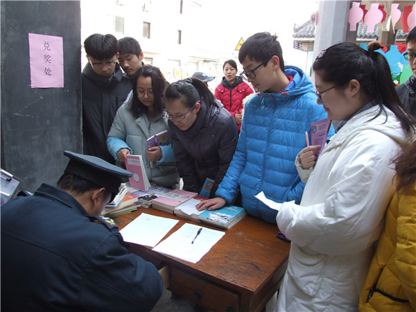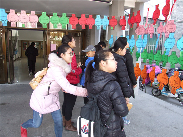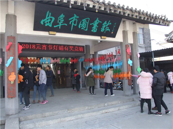 在元宵佳节,猜灯谜是国人过元宵的重要文娱形式。3月2日至3日,曲阜市在图书馆大门口举办了“猜灯谜”活动。欢乐闹元宵,现场有600余条谜语及丰富的礼品,谜语内容包罗万象,既有传统的猜地名、人物等,又含有国学知识、图书馆宣传等相关知识,很多慕名前来猜谜的小读者和家长们站在谜面旁,迅速投入了紧张而欢快的猜谜活动中。 市民不仅可以现场感受中华民族传统文化的浓厚魅力,再度重温农历新春的热闹喜庆,还能够学习灯谜文化知识,体会到中国传统文化之美,曲阜市图书馆与众多读者一道度过一个祥和别样的元宵佳节。