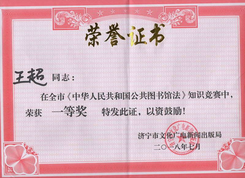 在初赛中,我馆员工王超表现优秀,在济宁赛区十二县市区初赛中获得第一名成绩。同时,曲阜市图书馆获得《中华人民共和国公共图书馆法》知识竞赛优秀组织奖。