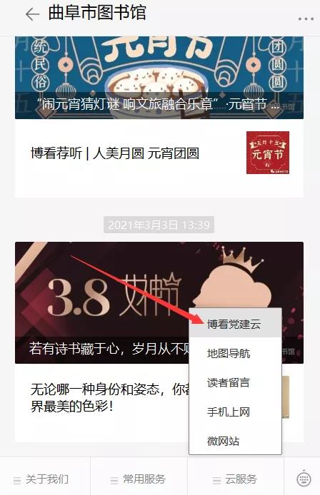 1、关注【曲阜市图书馆】微信公众号,点击菜单【云服务】——【博看党建云】进入首页。
